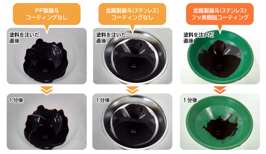 こうした場合には、使用する漏斗にフッ素樹脂コーティングを施すことで、塗料の滑落性が向上し、作業効率の改善が期待できます。
