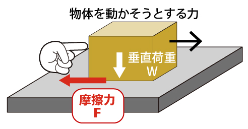 摩擦力は、F=μWで表されます。(F:摩擦力、μ:摩擦係数、W:垂直荷重)